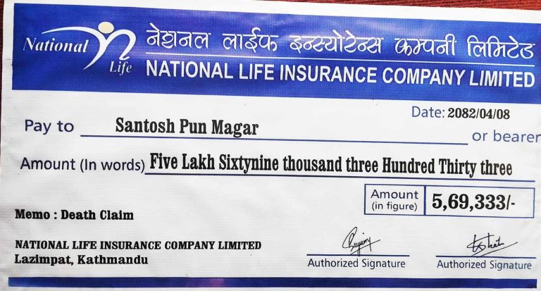 उक्त चेक मृतकको सन्तान सन्तोष बुढा मगरको नाममा जारी गरिएको थियो भने चेक मृतकका पति रुपलाल पुन मगरलाई हस्तान्तरण गरिएको कम्पनीले जनाएको छ।